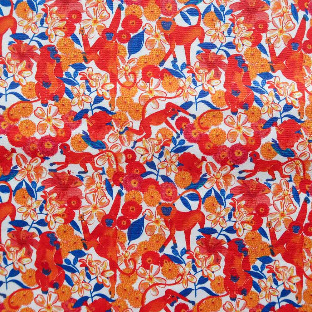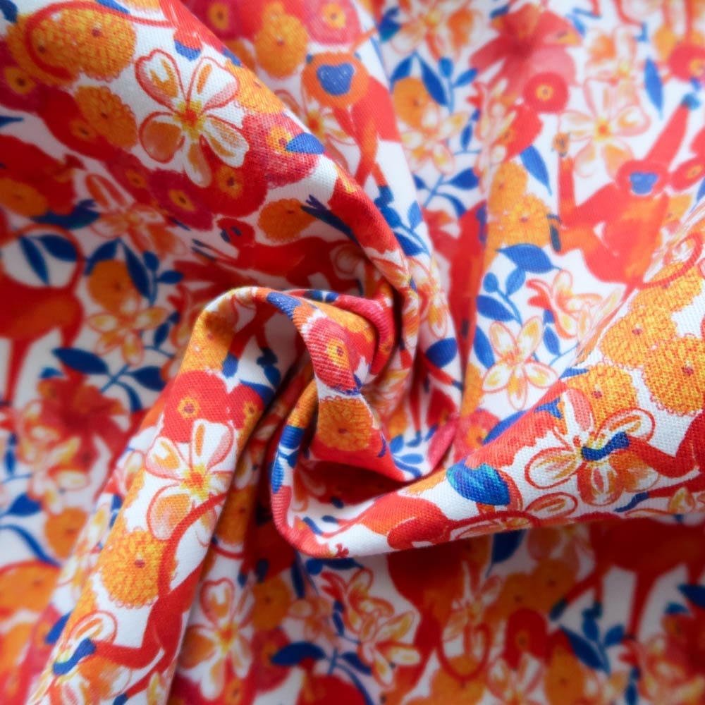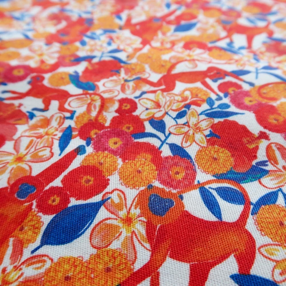 Le motif Bollywood, peint ร  la gouache dans mon atelier angevin, est imprimรฉ en France sur une gabardine de coton.