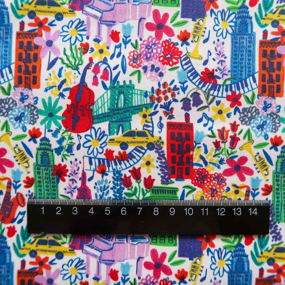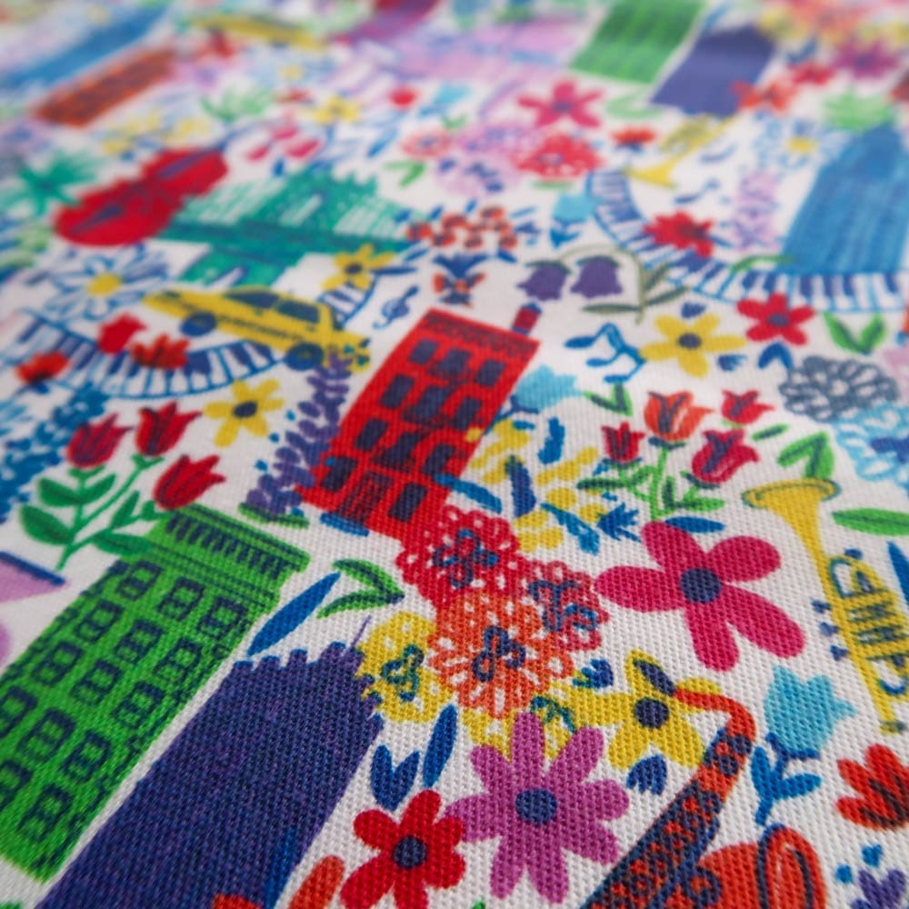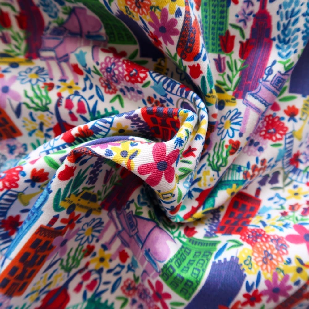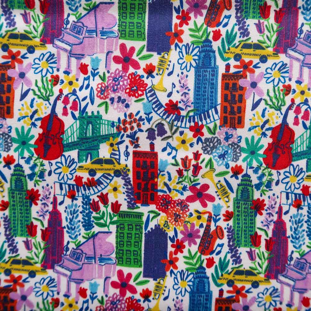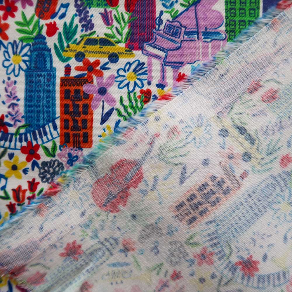 Le motif Broadway, peint ร la gouache et aux feutres dans mon atelier angevin, est imprimรฉ en France sur une gabardine de coton.