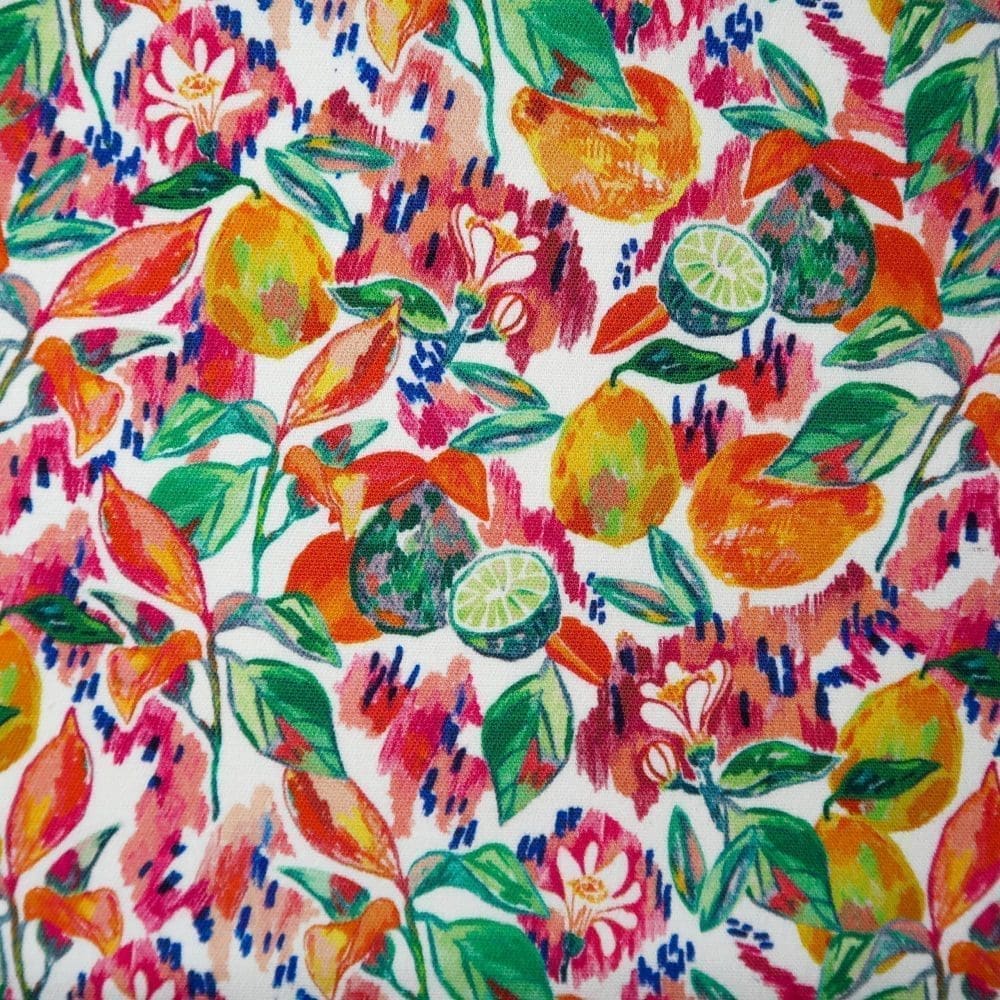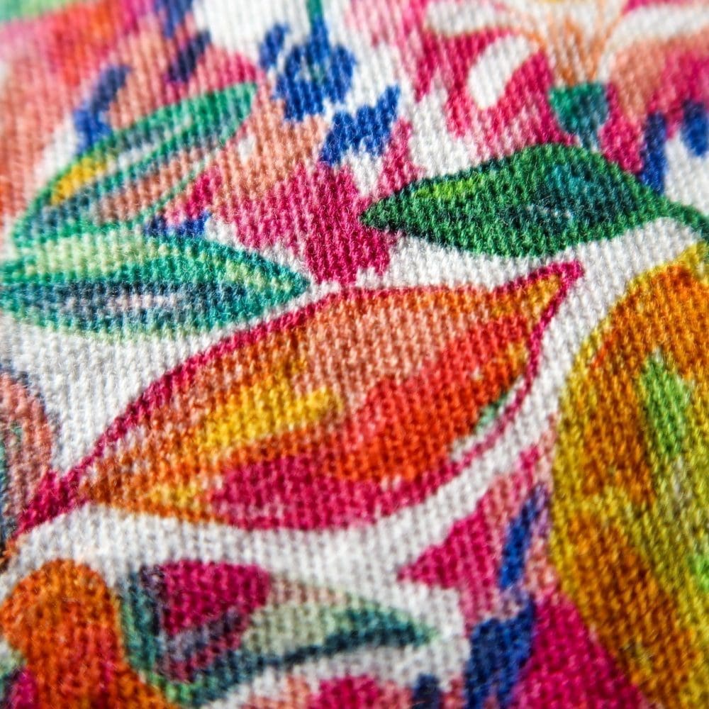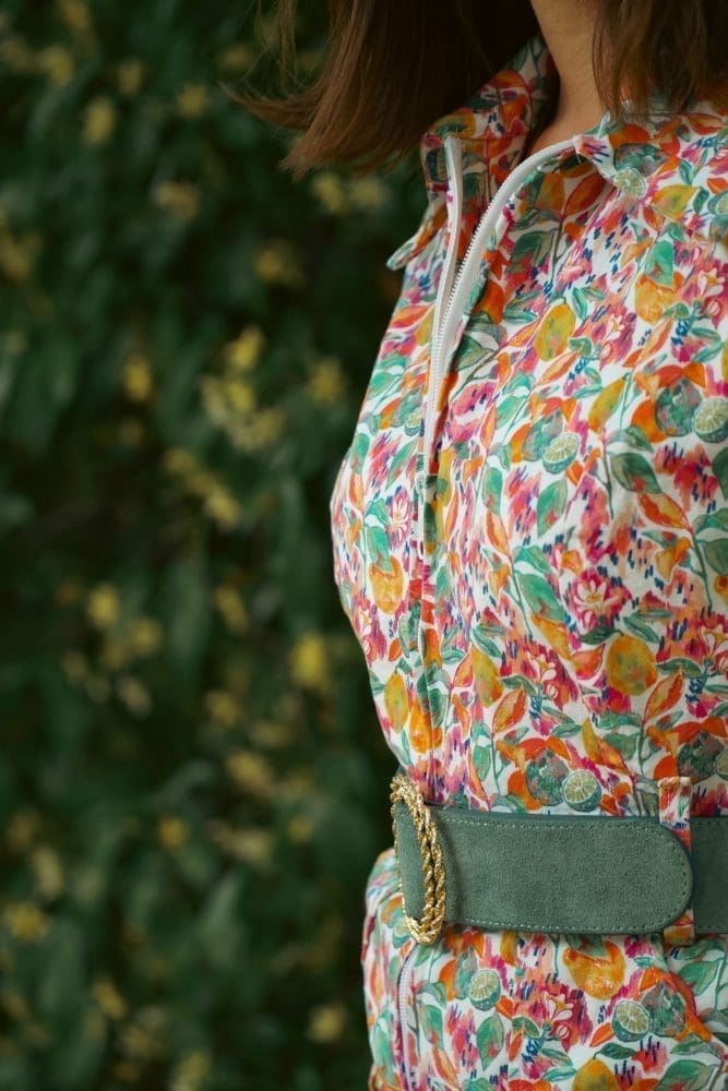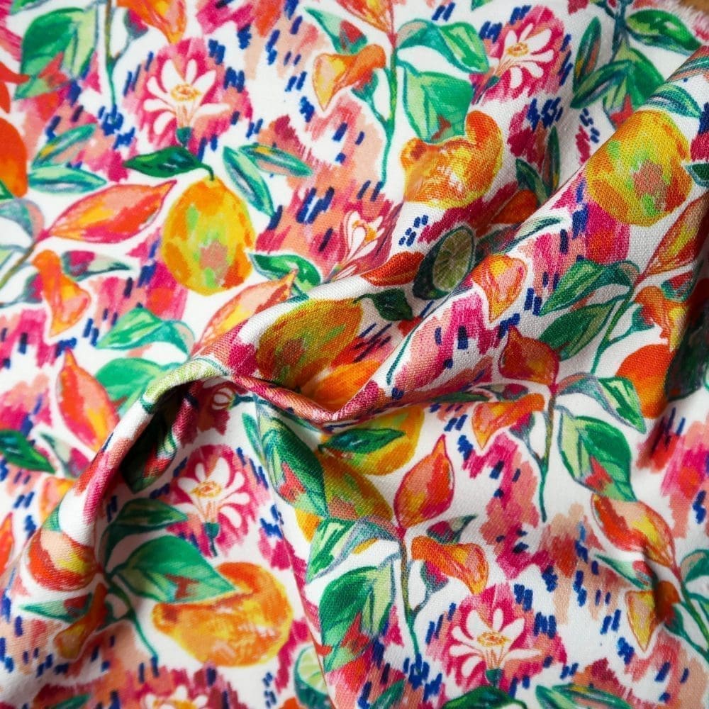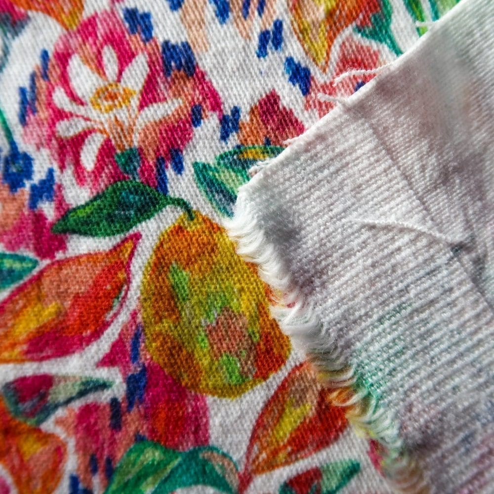 Le motif Taliouine, peint ร la gouache dans mon atelier angevin, est imprimรฉ en France sur une gabardine de coton.