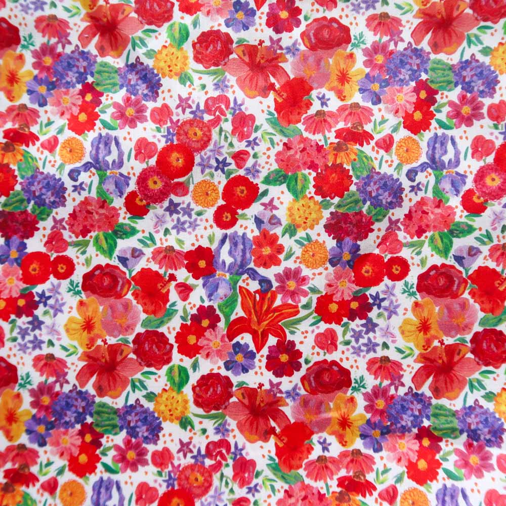 Le motif Fleurs d’été, peint à la gouache dans mon atelier angevin, est imprimé en France sur un satin de coton.