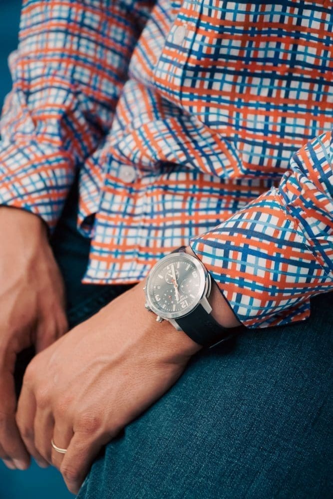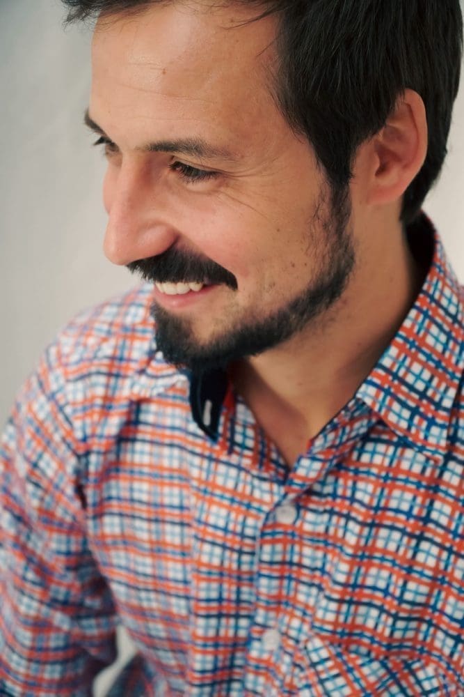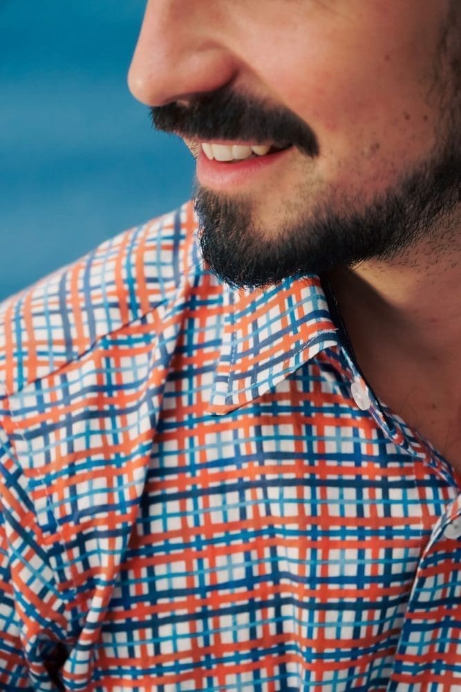 Gaëtan porte une chemise issue du livre « Couture au masculin » paru aux Editions de Saxe