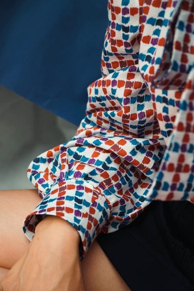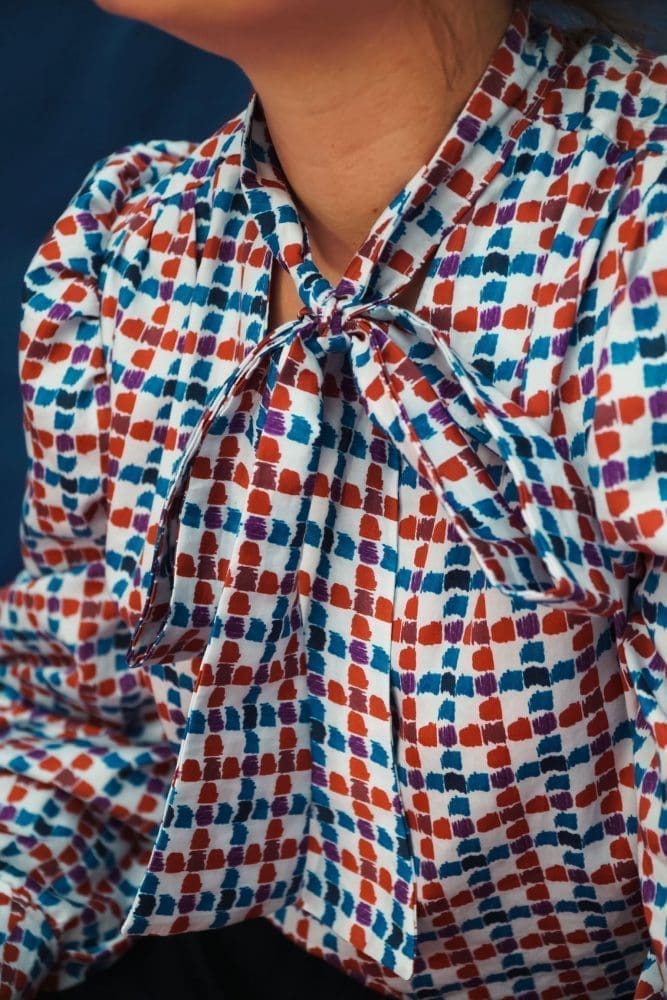 Le patron de la blouse de Carole est « Place des arts » de Atelier 8 avril.